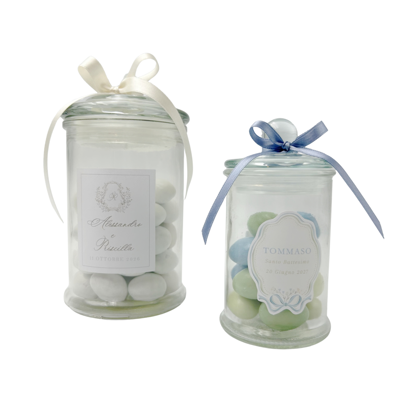 Barattolo in vetro con tappo ermetico, adatta come bomboniera per eventi.