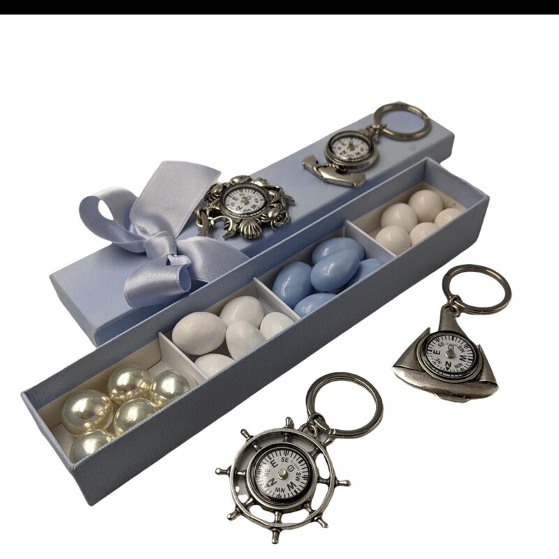 Bussole funzionanti con decorazioni che richiamano il tema del mare in argento rivestitoMisura media di una bussola: diametro 5 x h 8,5 cm ( compresa la misura dell'anello )