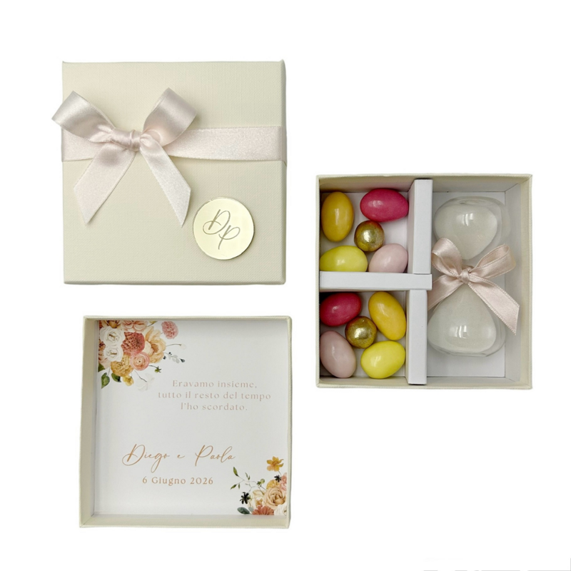 Clessidra in vetro con sabbia bianca confezionata in scatola degustazione 10 x 10 x 4 cm con apertura fondo e coperchio, compresa di divisore con 10 confetti a scelta, nastro, personalizzazione sul coperchio esterno e internoMisura clessidra h 8 x 4 cmScatola disponibile in 8 colori