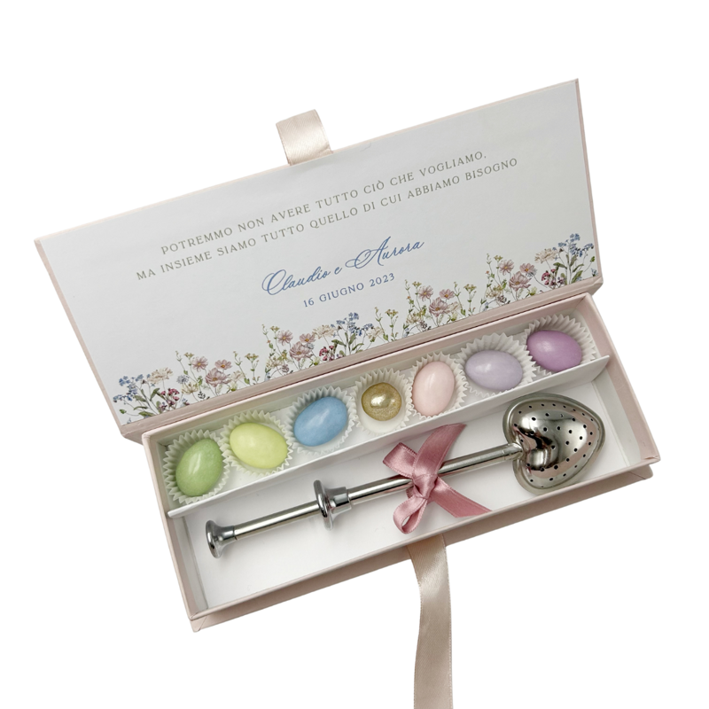 Infusore per tè in acciaio inox confezionato in scatola degustazione 19 x 7 x 3 cm con apertura a libro, compresa di 7 confetti a scelta incartati singolarmente in pirottini,
