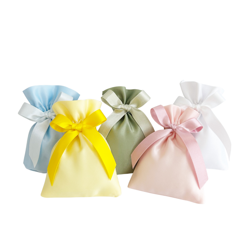 Sacchetto in raso completo di 5 confetti a scelta incartati in carta alimentare, bigliettino interno o esterno con grafica personalizzata e nastro in raso a scelta