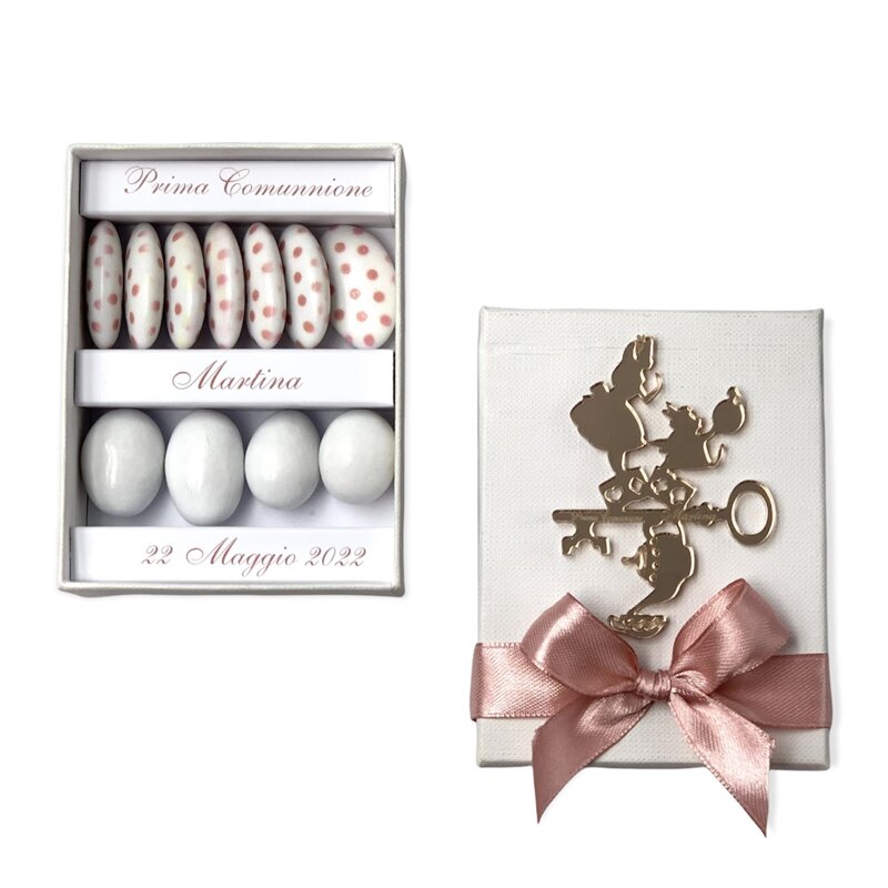 Scatola in cartone rigido misura 10 x 7,5 x 3,2 cm compresa di 11 confetti ( 7 di mandola avola pelata o confetti con i pois al cioccolato e 4 confetti di gusti assortiti), fustella personalizzata interna, personalizzazione esterna e nastro.